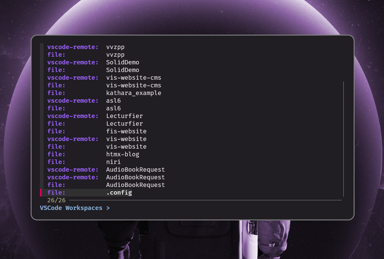 Now I can simply run Ctrl+T (tbd, might change) and open a nice popup that allows me to pick the VSCode workspace I want to resume.