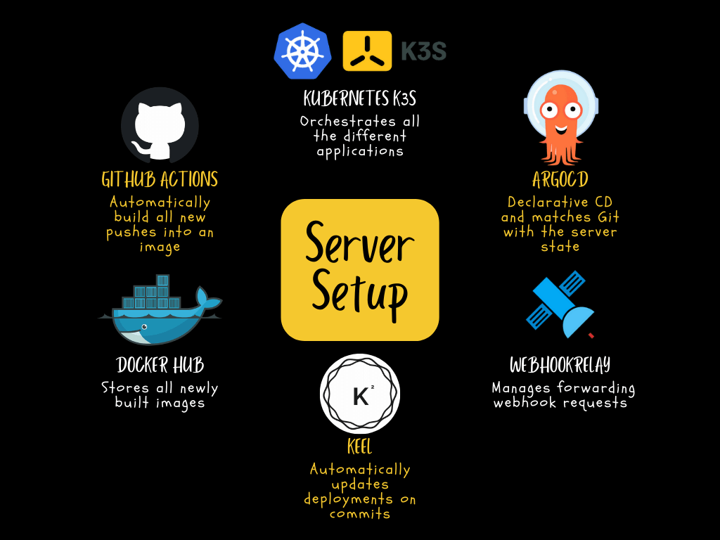 ArgoCD is a way to store all your deployment configs inside a Git repository and it makes sure that the Kubernetes setup matches exactly what is on Git. This is perfect. It allows me to store how applications should be started and what peristent volumes and ingresses should exist without even having to access the server. I open my Kubernetes repo, throw in another file for my new deployment, push and then the deployment automatically starts up.