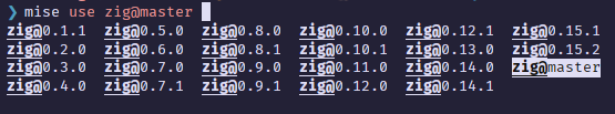 If you have mise set up in your shell config with mise activate, it will automatically download and add tools your shell environment when you enter a project directory, while removing them again when you leave the directory. My workflow when setting up a new project with mise is to simply enter the directory, type mise use zig@, tap tab twice for autocomplete to kick in, up arrow to jump to the most up to date version, and then I simply select whatever new version I want. For languages, I'll fixate the version (to at least the major version), while for less important tools like just I'll use @latest.